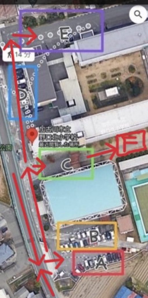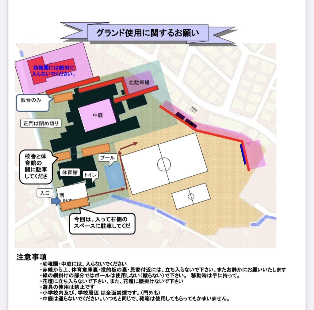 ★駐車場は案内写真のAゾーンを播磨SCが使用できます。その他のゾーンはバレーと小野南が使用します。